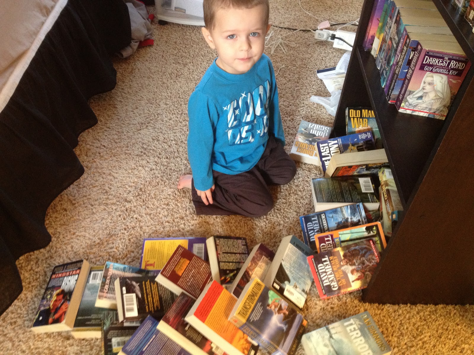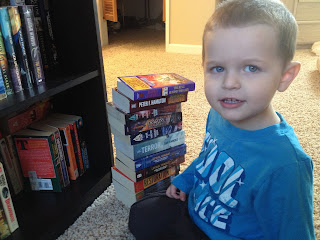 My son likes to play with my books like most kids play with blocks, he builds towers and then topples them over: